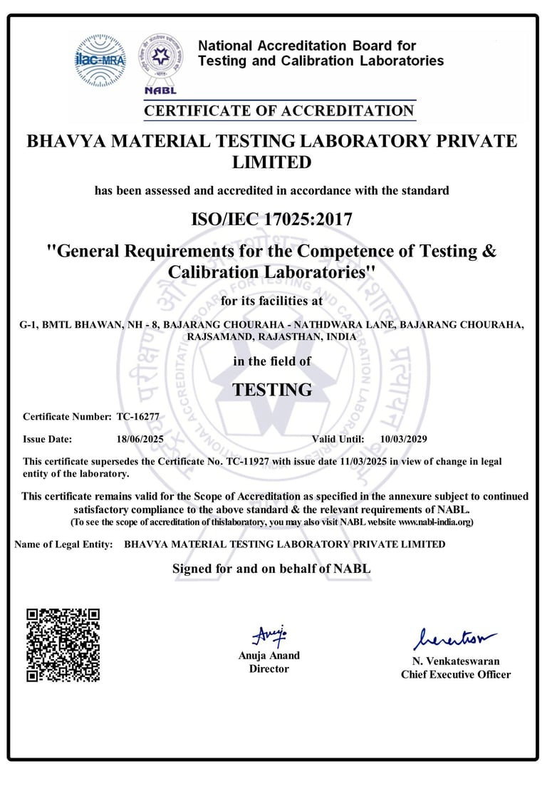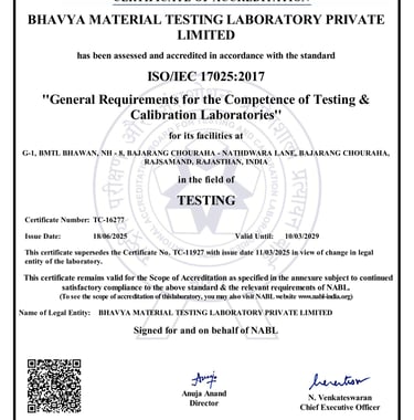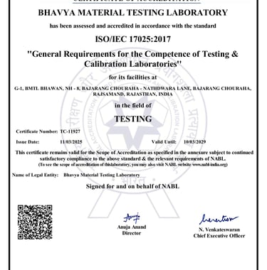 At Bhavya Material Testing Laboratory, we follow a well-structured quality assurance and quality management system to ensure the highest standards in testing and analytical services. Our laboratory operates in compliance with ISO/IEC/17025:2017.