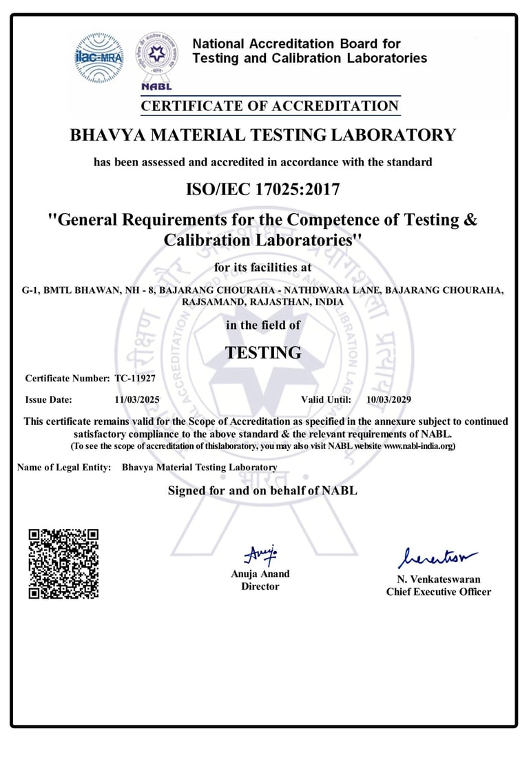 Welcome to Bhavya Material Testing Laboratory (BMTL),a leading testing laboratory in Rajasthan, India. Since 2015, we have been providing comprehensive laboratory services in the field of building material testing, geotechnical investigation, and nondestructive testing. Our laboratory follows ISO/IEC/17025:2017 standards. We offer testing and advisory services for soil, building materials, cement, bitumen, cement concrete, paver, building stones, steel, and other products. Trust BMTL for accurate and reliable testing results.